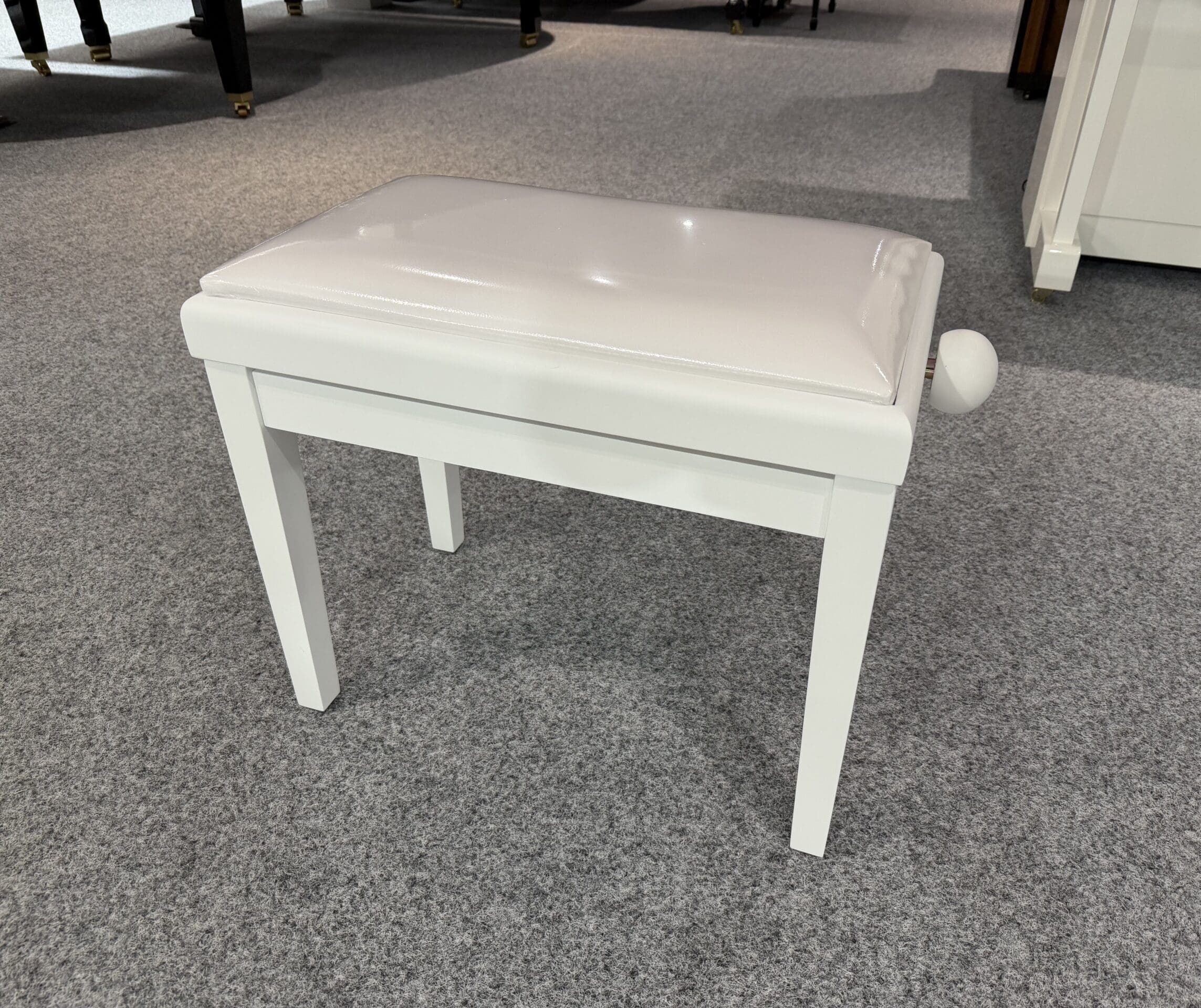 This luxurious stool has a white vinyl top, and all the woodwork is made from the highest quality timber and finished in white satin. The rise and fall mechanism is sturdy and does not rock when in use.